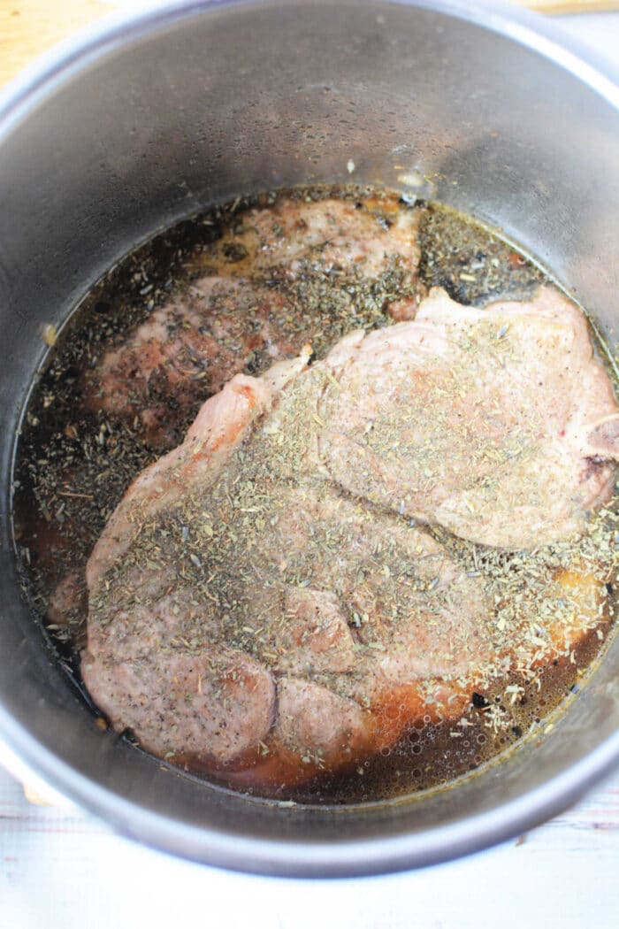 - Season pork steaks with salt and pepper. Add oil to the pressure cooker and turn on saute function. When oil is hot add pork steaks and sear on both sides, you may need to work in batches. Remove and set aside. Season with Italian seasonings.