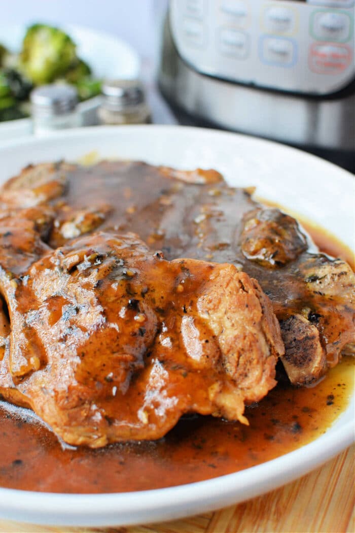 Below we will share this cooking method, which we love. Why?? Because cooking meat with high pressure and a natural release in the end to lock in those juices is the best. NO heating up the whole house and I always get the moistest bites of these or pork shoulder steak this way.