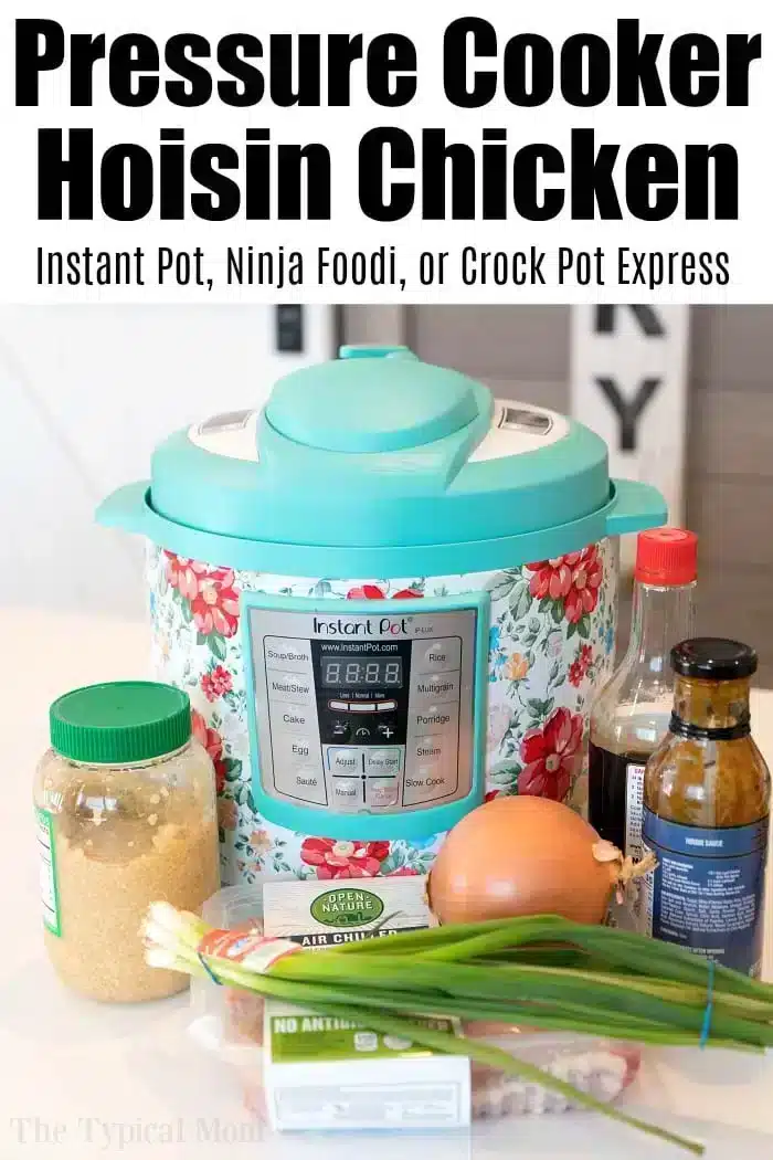 A floral Instant Pot sits on the counter, ready for pressure cooker hoisin chicken with sauces, garlic, ginger, and green onions.