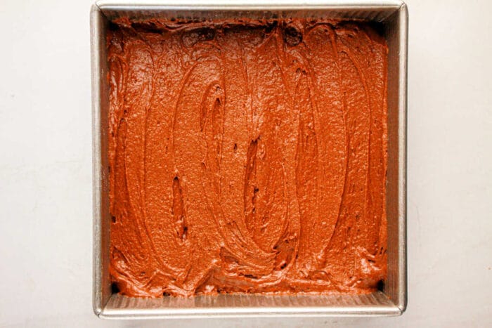 - Pour the batter into the prepared pan and place in the oven and bake for 23-27 minutes, or until a toothpick comes out mostly cleanly. For fudgy – 21-25 minutes, for cakey 24-27 minutes. *test with a toothpick, fudgy should have moist crumbs (not batter) attached, cakey should come out clean.