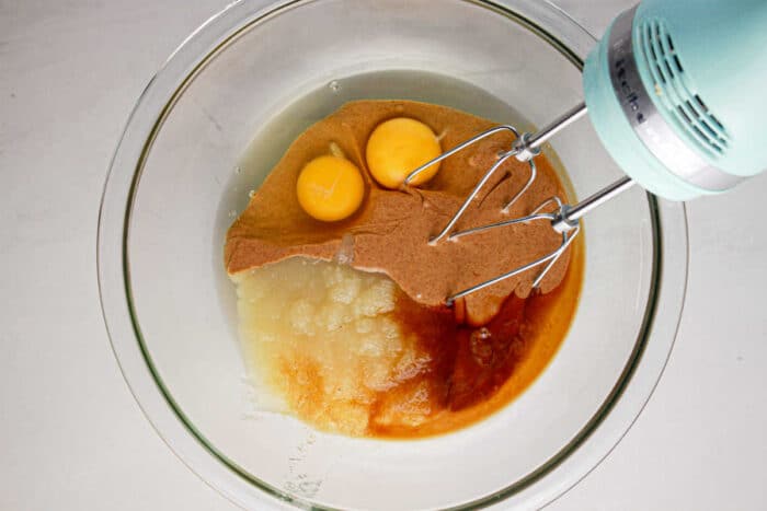 - In a large bowl, place the almond butter, eggs, applesauce, and vanilla and use an electric mixer to blend them until creamy.