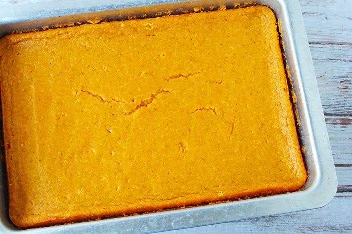 - Bake for 40-50 minutes until pumpkin layer is set and center is no longer wet and gooey.