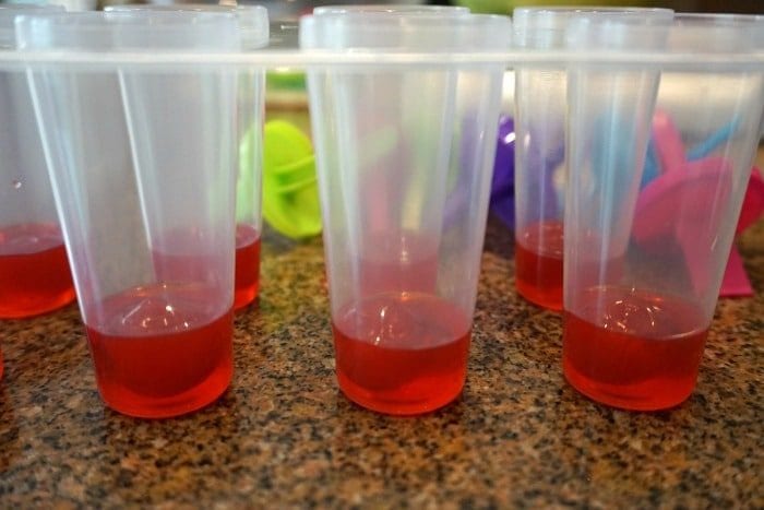All you need is a popsicle mold, liquids in these colors like we used here and some imagination. You could use little Dixie cups too if that is all you have with wooden sticks! Kids love to help so get them in the kitchen with you and call it an edible craft. 😉