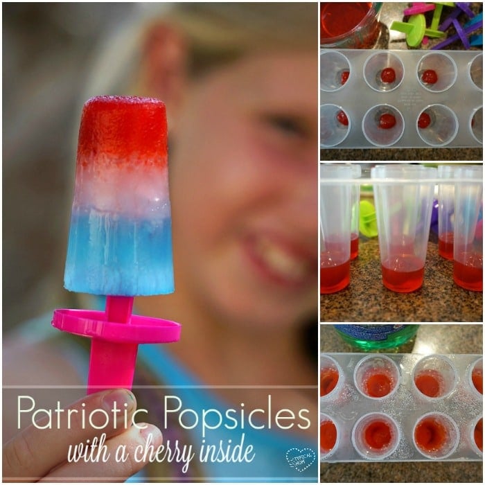 It’s Memorial Day or the 4th of July and you want to make a patriotic dessert, try our easy red white and blue popsicles recipe. Fun like our rainbow popsicles with juice or Gatorade, and there’s a cherry hidden inside too!