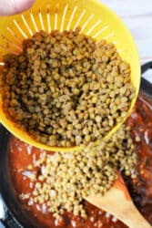 You could start with the directions to cook Slow Cooker Lentils. Then drain and add in the sauce items and stir. Allow to sit for at least 30 minutes. This is kinda’ a thicker version of our Lentil Stew Recipe we love too.
