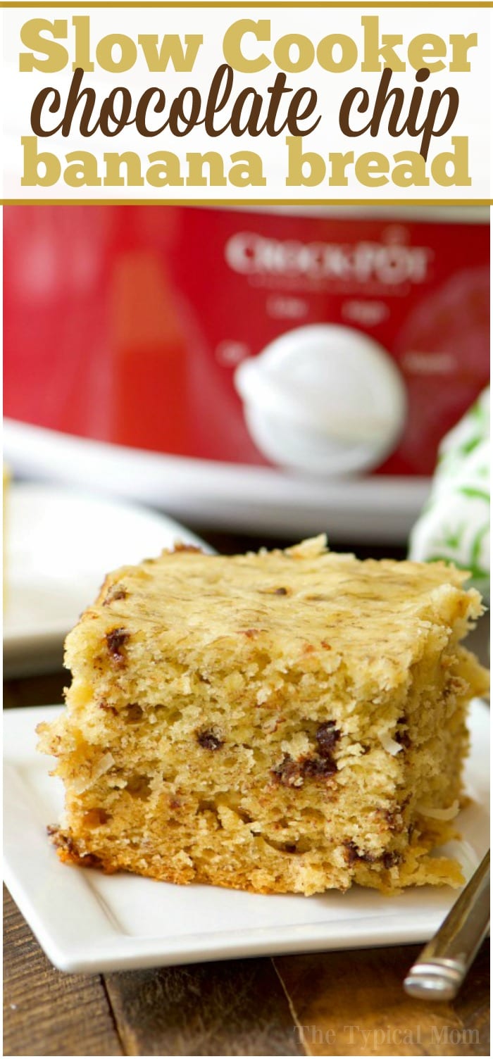 Our homemade slow cooker banana bread recipe with chocolate chips is perfect for breakfast or brunch! Moist sweet bread baked in a Crockpot is a great new way to cook it.
