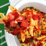 This is a great football party food ideas because they think outside of the box are are always a hit with everyone. Once you spend the 30 min. or so preparing your Crock pot pizza casserole you won’t have to touch it again. You can just turn it on warm and enjoy yourself. It’s great for busy days too because your family will love it and it can stay warm for a few hours. Bonus – it’s great the next day warmed up for lunch too!