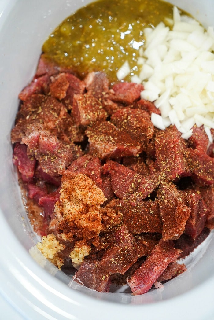 - Trim and cube pork into pieces about 1.5'x1.5" or so. Put into slow cooker.