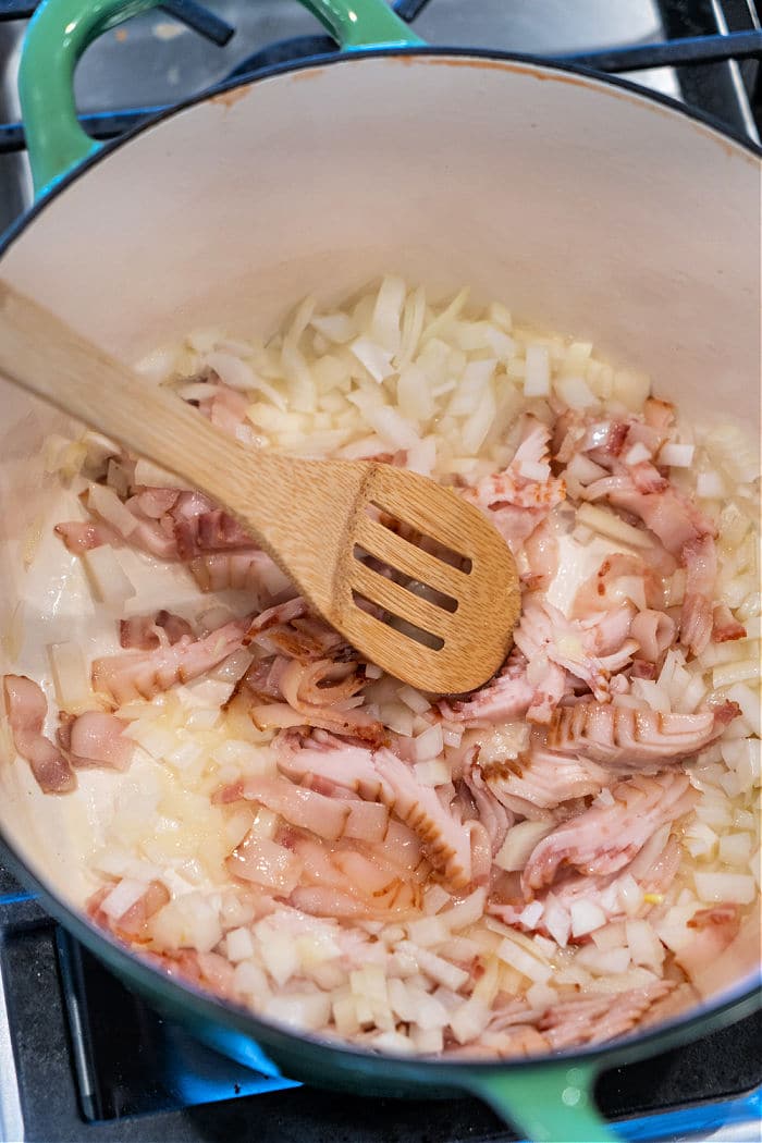 - In a dutch oven or pot over medium heat, add olive oil, diced bacon and onions. Cook until bacon is a bit crispy and onions are softened.