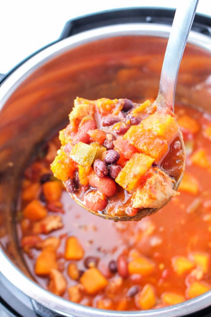 Sweet potato chili in the Instant Pot with black benas is a quick nutritious stew for dinner. With diced up baked sweet potatoes cooked to tender, this is a fast way to make this popular dish.