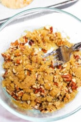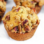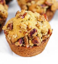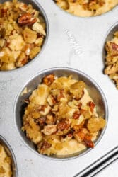 - In a small bowl, combine ingredients for topping by mixing together melted butter, flour, brown sugar, and pecans to create a crumble topping. Sprinkle topping over each muffin.