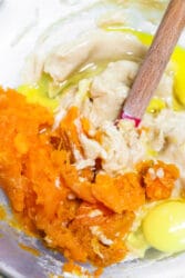 Filling the muffin cups 3/4 of the way full makes the ratio of topping to bottoms turns out just right. As with our sweet potato cake you always want to incorporate wet items in one and dry in another before combining or the leavening agents won’t work right. Here is a quick step by step rundown. There is a printable recipe card with ingredients below as well: